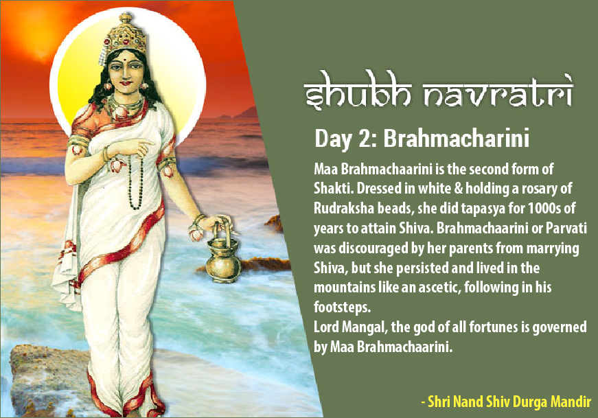 | Stuti, Mantra & Aarti Navratri is a festival dedicated to worship Goddess Durga. In Sanskrit, the word ‘nava’ means nine and ‘ratri’ means nights i.e. ‘nine nights’. Each of these nine days of Navratri is dedicated to a particular Goddess who is worshiped on that day. Goddess Brahmacharini is worshipped on the second day of Navratri. Iconography – Goddess Brahmacharini is depicted as walking on the bare feet. She carries Jap Mala in the right hand and Kamandal in the left hand. Details – Goddess Brahmacharini did severe penance to get Lord Shiva as her husband. She performed hard austerity and due to which she was called Brahmacharini. It is stated that during her penance to get Lord Shiva as her husband, she spent 1000 years on the diet of flowers and fruits and after that she was on the diet on leafy vegetables while sleeping on the floor. Further she followed strict fasting regimen while staying at open place in scorching summers, harsh winters and stormy rains. According to Hindu religion, she was on diet of Bilva leaves for 3000 years while she prayed to Lord Shiva. Later she even stopped eating Bilva leaves and continued her penance without any food and water. She was known as Aparna when she stopped eating Bilva leaves. Governing Planet – It is believed that Lord Mangal, the provider of all fortunes, is governed by Goddess Brahmacharini. Devanagari Name – ब्रह्मचारिणी Mantra ॐ देवी ब्रह्मचारिण्यै नमः॥ Om Devi Brahmacharinyai Namah॥ Prarthana दधाना कर पद्माभ्यामक्षमाला कमण्डलू। देवी प्रसीदतु मयि ब्रह्मचारिण्यनुत्तमा॥ Dadhana Kara Padmabhyamakshamala Kamandalu। Devi Prasidatu Mayi Brahmacharinyanuttama॥ Stuti या देवी सर्वभूतेषु माँ ब्रह्मचारिणी रूपेण संस्थिता। नमस्तस्यै नमस्तस्यै नमस्तस्यै नमो नमः॥ Ya Devi Sarvabhuteshu Maa Brahmacharini Rupena Samsthita। Namastasyai Namastasyai Namastasyai Namo Namah॥ Dhyana वन्दे वाञ्छितलाभाय चन्द्रार्धकृतशेखराम्। जपमाला कमण्डलु धरा ब्रह्मचारिणी शुभाम्॥ गौरवर्णा स्वाधिष्ठानस्थिता द्वितीय दुर्गा त्रिनेत्राम्। धवल परिधाना ब्रह्मरूपा पुष्पालङ्कार भूषिताम्॥ परम वन्दना पल्लवाधरां कान्त कपोला पीन। पयोधराम् कमनीया लावणयं स्मेरमुखी निम्ननाभि नितम्बनीम्॥ Vande Vanchhitalabhaya Chandrardhakritashekharam। Japamala Kamandalu Dhara Brahmacharini Shubham॥ Gauravarna Swadhishthanasthita Dwitiya Durga Trinetram। Dhawala Paridhana Brahmarupa Pushpalankara Bhushitam॥ Parama Vandana Pallavaradharam Kanta Kapola Pina। Payodharam Kamaniya Lavanayam Smeramukhi Nimnanabhi Nitambanim॥ Stotra तपश्चारिणी त्वंहि तापत्रय निवारणीम्। ब्रह्मरूपधरा ब्रह्मचारिणी प्रणमाम्यहम्॥ शङ्करप्रिया त्वंहि भुक्ति-मुक्ति दायिनी। शान्तिदा ज्ञानदा ब्रह्मचारिणी प्रणमाम्यहम्॥ Tapashcharini Tvamhi Tapatraya Nivaranim। Brahmarupadhara Brahmacharini Pranamamyaham॥ Shankarapriya Tvamhi Bhukti-Mukti Dayini। Shantida Jnanada Brahmacharini Pranamamyaham॥ Kavacha त्रिपुरा में हृदयम् पातु ललाटे पातु शङ्करभामिनी। अर्पण सदापातु नेत्रो, अर्धरी च कपोलो॥ पञ्चदशी कण्ठे पातु मध्यदेशे पातु महेश्वरी॥ षोडशी सदापातु नाभो गृहो च पादयो। अङ्ग प्रत्यङ्ग सतत पातु ब्रह्मचारिणी। Tripura Mein Hridayam Patu Lalate Patu Shankarabhamini। Arpana Sadapatu Netro, Ardhari Cha Kapolo॥ Panchadashi Kanthe Patu Madhyadeshe Patu Maheshwari॥ Shodashi Sadapatu Nabho Griho Cha Padayo। Anga Pratyanga Satata Patu Brahmacharini। Aarti जय अंबे ब्रह्माचारिणी माता। जय चतुरानन प्रिय सुख दाता। ब्रह्मा जी के मन भाती हो। ज्ञान सभी को सिखलाती हो। ब्रह्मा मंत्र है जाप तुम्हारा। जिसको जपे सकल संसारा। जय गायत्री वेद की माता। जो मन निस दिन तुम्हें ध्याता। कमी कोई रहने न पाए। कोई भी दुख सहने न पाए। उसकी विरति रहे ठिकाने। जो तेरी महिमा को जाने। रुद्राक्ष की माला ले कर। जपे जो मंत्र श्रद्धा दे कर। आलस छोड़ करे गुणगाना। मां तुम उसको सुख पहुंचाना। ब्रह्माचारिणी तेरो नाम। पूर्ण करो सब मेरे काम। भक्त तेरे च